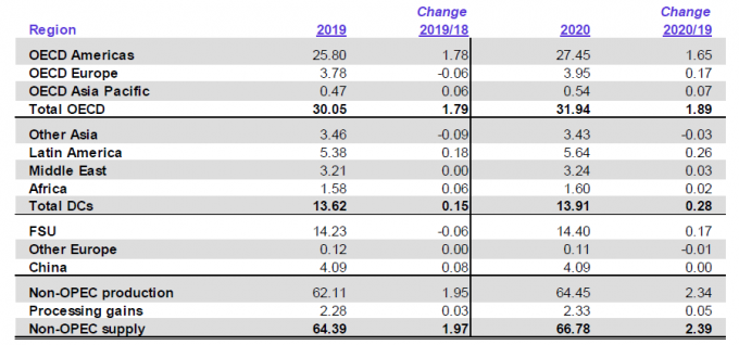 Показатель роста предложения в странах, не входящих в ОПЕК, в 2020 году также был пересмотрен в сторону снижения на 50 тыс. баррелей в день до 2.39 млн. баррелей в день. Общий показатель составляет 66.78 млн. баррелей в день. Это в значительной степени обусловлено снижением показателей в Бразилии.