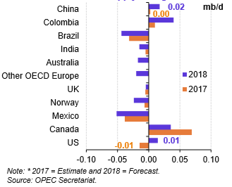 Прогноз поставок на 2018 год из стран, не относящихся к ОПЕК, также был пересмотрен на 0,09 мб/д до 58,54 мб/д, а рост уменьшен на 0,07 мб/д до 0,87 мб/д. Любые изменения в прогнозе на 2017 и 2018 года для стран, не входящих в ОПЕК, основаны на разработке нефтяного месторождения, периодическом и непредвиденном техническом обслуживании, неожиданных отключениях из-за погодных условий и сбоев, новых стартапах и планах расширения производства.