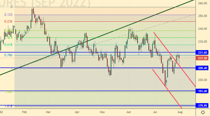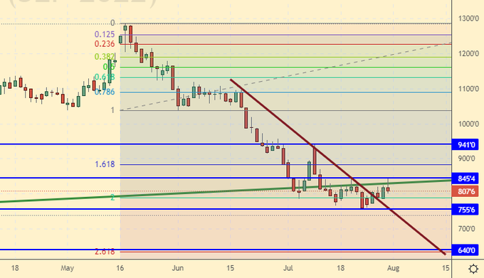 Growth scenario: consider the September futures, the expiration date is September 14th. Unexpected sharp growth on the back of good forecasts for gross output. Most likely we are seeing tough American speculation. We don’t buy.