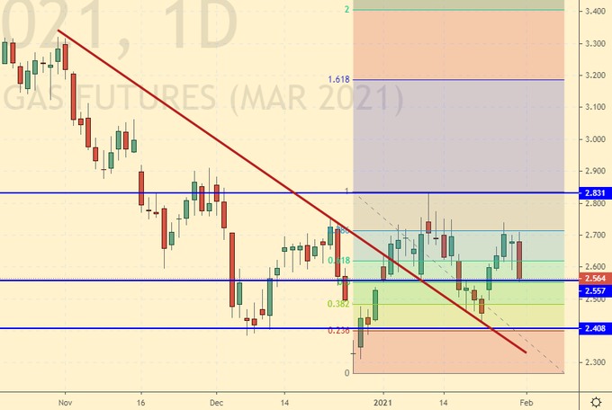 Growth scenario: March futures, expiration date February 24. It should be admitted that gas is not very satisfying. There is no power in the market. Friday’s red candle can drive the bulls away.