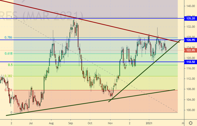 Growth scenario: March futures, expiration date March 19. The market is able to return to 115.0. The situation is ripe for a breakdown of support. We do not buy. If there is a rise above 128.00, think about buying.