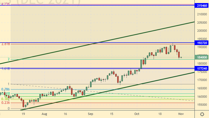 Growth scenario: following the fall of the ruble against the US dollar, the RTS index also fell. In the near future, it cannot be ruled out that the national currency will continue to grow due to the favorable external background, which will send the RTS index to the level of 215,000. It is possible that this target will be a task for the “Christmas rally” in the market in December. To enter the long, we are waiting for upward reversal signals.