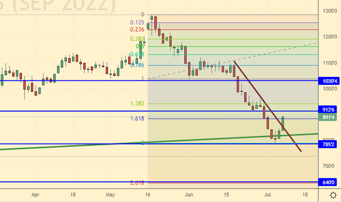 The market is waiting for the USDA July report on Tuesday. If we see a decrease in forecasts for the gross harvest, then this may push the grain market up for a while. If the June optimism continues, then we will stay in the range until the end of the month. In August, wheat will try to break through to the level of 650, and corn to the level of 550 cents per bushel. And this is where the correction phase in the grain market will end.