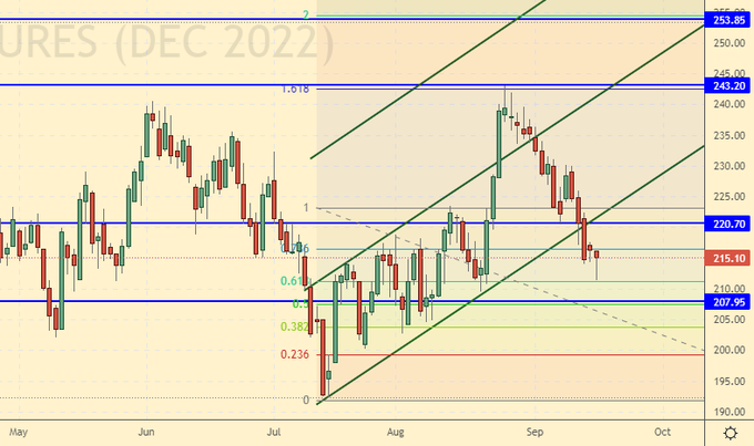 Growth scenario: consider the December futures, the expiration date is December 19. We keep the stop at 200.0 and continue to buy. Growth is possible.