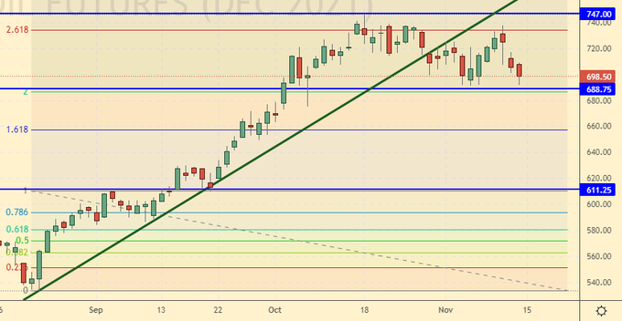 Growth scenario: December futures, the expiration date is December 10. No changes in the market. If we rise above 750.00, we will buy. The second option is to buy after falling to 615.00.