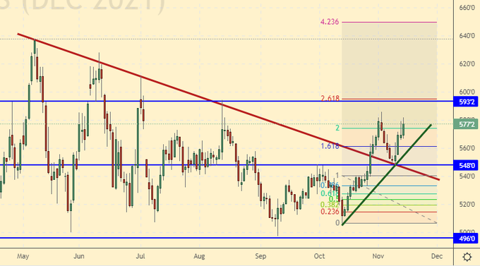 Growth scenario: December futures, expiration date December 14. We continue to hold longs with the target at 593.0. We do not open new positions up.