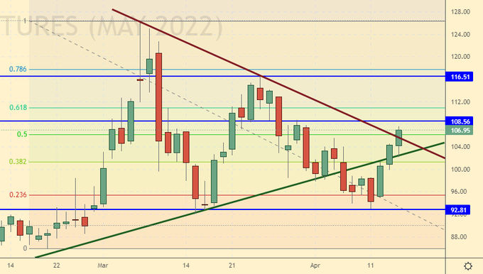 Growth scenario: we are considering the April futures, the expiration date is April 29. We will continue to keep long from 103.00. In the event of a fall to 105.00, those who wish can enter the purchase.