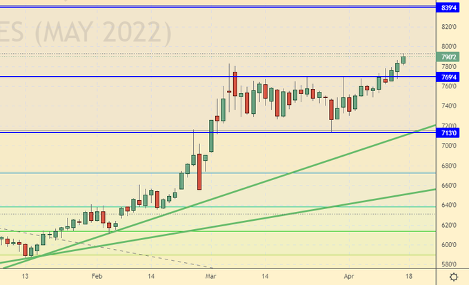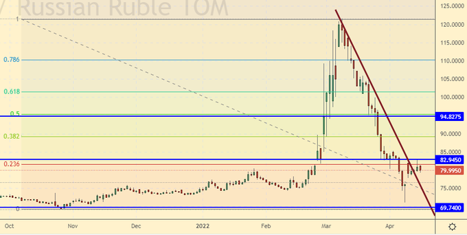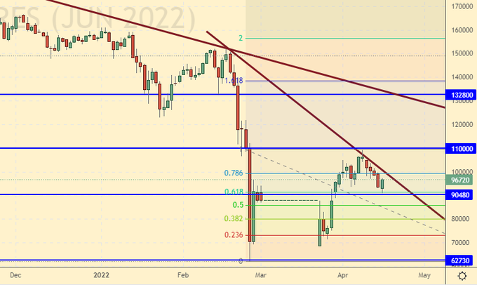 Growth scenario: a number of Russian public companies have introduced a moratorium on the publication of quarterly financial statements. In particular, this was done by three metallurgical plants MMK, NLMK and Severstal. It is possible that this practice will be expanded. What then, in this case, should minority shareholders do in the stock market? There are no fundamental guidelines. If an investor can still somehow believe, for example, in gold, then believing in a share of a single company without understanding its financial condition is extremely reckless. Comfortable for buying futures on the RTS index may be the level of 80,000. Long from current levels is possible, but looks somewhat overpriced.