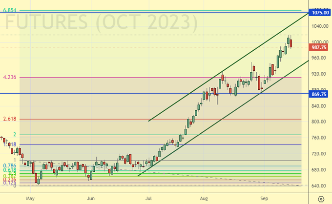 Growth scenario: we are considering October futures, expiration date is September 27. If there is a cold winter in Europe, and the prerequisites are there, then the gas will fly into space. We hold longs.