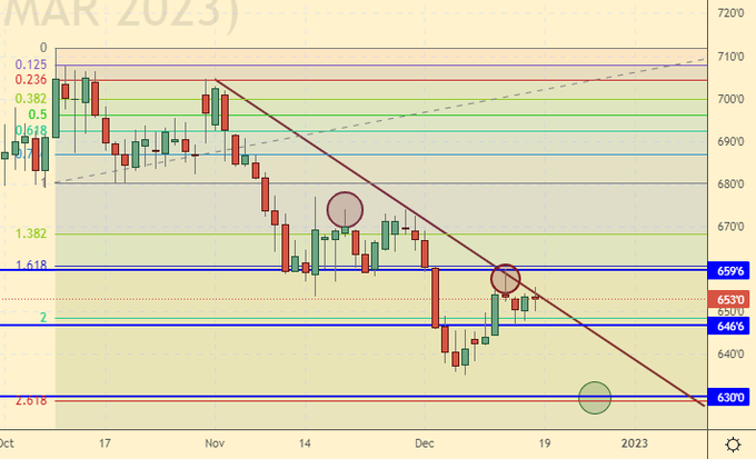 Fall scenario: here you can sell, and aggressively. There are big doubts that we will be able to take the resistance line around 660.0 cents per bushel and go up.
