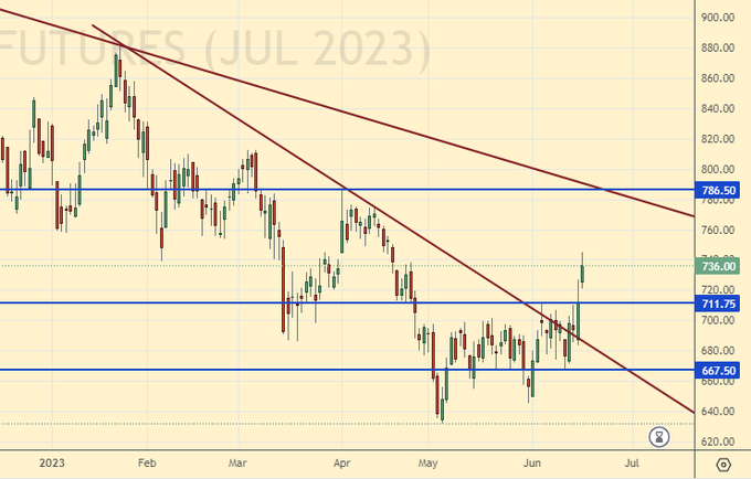 Growth scenario: we are considering the July futures, the expiration date is July 15. The purchase was correct. We hold longs. Cancellation of the grain deal will warm up the market. A move to 770.0 is not ruled out.