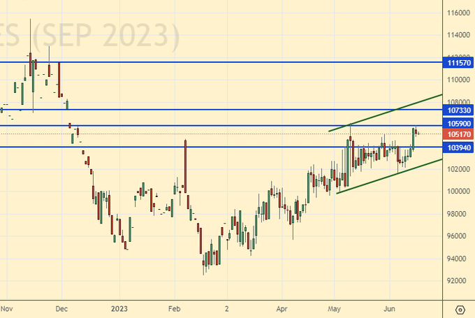 Fall scenario: we hold short with a stop order at 106700 (switched to a new contract).