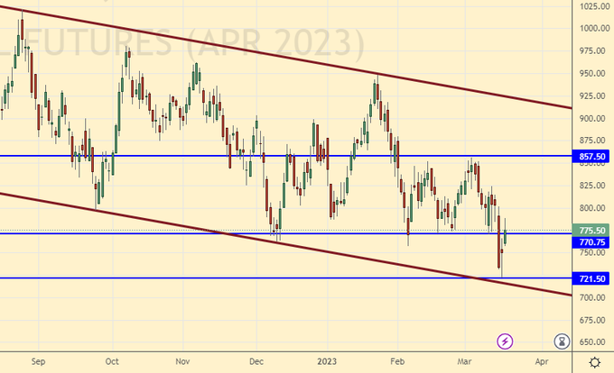 Oil prices dropped $10 or 12% over the week. Banking scandals in the US and Europe are unlikely to be over. This means that investor sentiment will continue to remain gloomy, which may lead to a decrease in economic activity. This probability is now being factored into the price of oil by the market. That is, there can be no question of any consumption records that OPEC dreams of. The G7 countries plan to keep the price ceiling for Russian oil at $60 per barrel. A number of analysts predicted a lowering of the ceiling to $50, but the predictions did not come true. Comrade Xi, one of the main buyers of Russian resources, is coming to Russia next week. Much in the Russian economy will now depend on the mood of China. I do not want to write the word «everything» yet.