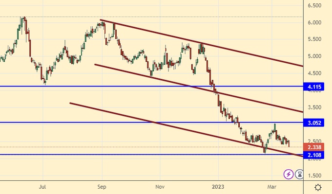 Growth scenario: we are considering the April futures, the expiration date is March 29. Given the fall in the oil market, we cannot rule out a further decline in quotations for gas. We keep old longs, we do not open new positions.