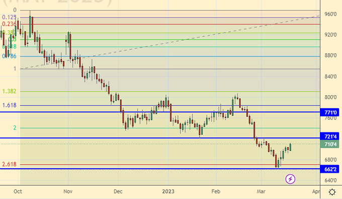 Growth scenario: consider the May futures, the expiration date is May 12. We continue to reluctantly recover from the fall in February. The market is able to move to 770.0 before the May USDA meeting. We hold longs.