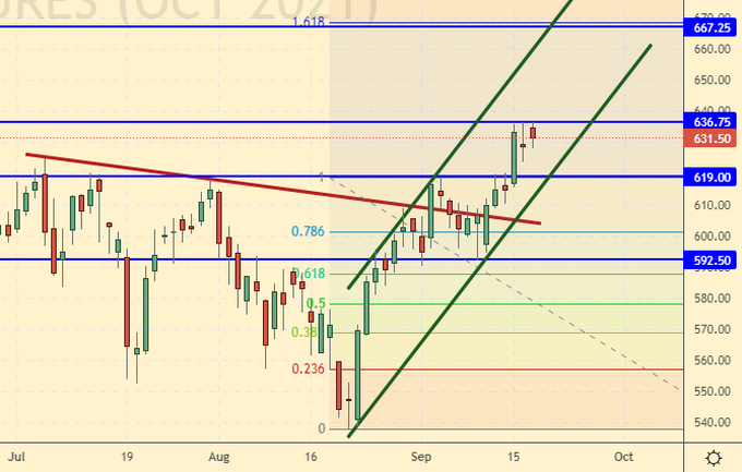 Growth scenario: October futures, the expiration date is October 12. We did not believe in the growth of the market, but he picked up and lifted his nose. If there is a rollback to 610.0, we will buy it.