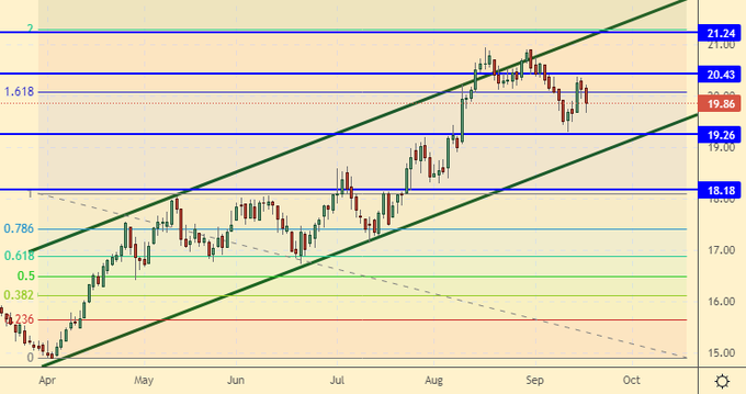 Growth scenario: November futures, the expiration date is October 20. Prices did not manage to close above 73.00, which gives rise to some doubts about the growth, but in general, the situation is behind the bulls.