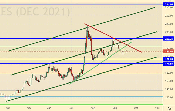 Growth scenario: October futures, expiration date September 28. The market reached our target at 5.40. If there is a rollback to 4.20, you can buy again. The gas situation in Europe will be difficult for the entire heating season.