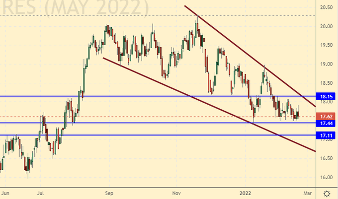 Growth scenario: May futures, the expiration date is April 29. An interesting «pennant» is drawn. In case of its breakdown upwards, we will leave at least by 20.00. Here you can buy. In case of growth above 18.70, you can add to the longs.