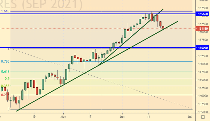 Growth scenario: July futures, expiration date July 14. The buyers did not hold the situation and sagged. The engulfing combination of the last two daily candles from 637.0 does not cause much emotion, since there is a threat of a breakdown of the extended support line. Sellers won’t just give up. Out of the market.