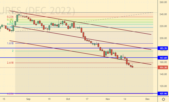 Growth scenario: consider the December futures, the expiration date is December 19. The market failed to stop at 160.0 and continued to fall. This came as a surprise to us. We keep previously open longs, we do not open new ones.