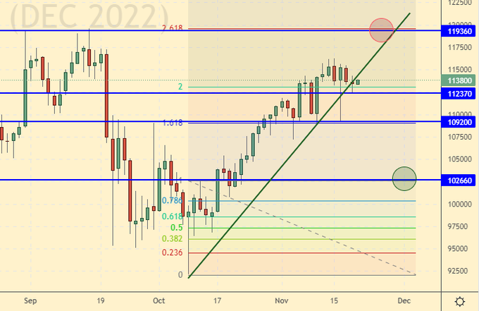 Growth scenario: consider the December futures, the expiration date is December 15th. We will continue to hold longs in anticipation of a move to 120000. We cannot deny the possibility of a corrective move to 103000, so we will move the stop order closer to the current levels.