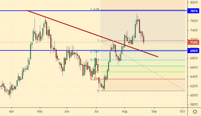 Growth scenario: September futures, expiration date September 14. We are not buying yet. We are betting that under the pressure of the new harvest, prices will fall below 700.0 cents per bushel.