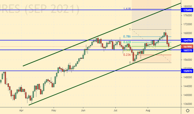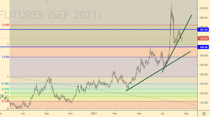 Growth scenario: September futures, expiration date September 20. The surge in prices from 160.00 to 215.00 is still the main bullish event. It will not be easy for the market to go below 170.00, so we keep the long counting on the resumption of growth.