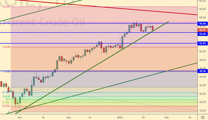 Growth scenario: we see a way out of consolidation upwards. On Monday there may be a gap again upwards by 30-50 kopecks due to the nervous situation about Navalny. Europe demands to release him from custody and threatens with sanctions. Let us also note the positive, the desire of the Americans to extend the START treaty for five years, as the Kremlin proposed, suggests that not all channels of communication with Washington are closed.