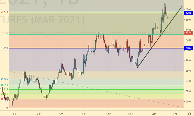 Growth scenario: February futures, expiration date February 11th. We see a break through the support line. We look forward to continued price decline. The current levels for purchases are too high.