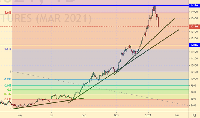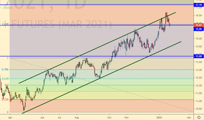 Growth scenario: March futures, expiration date February 26. In the current circumstances, we will expect a rollback to 14.00. The current levels are high. Note that we have not yet reached the target at 17.18.