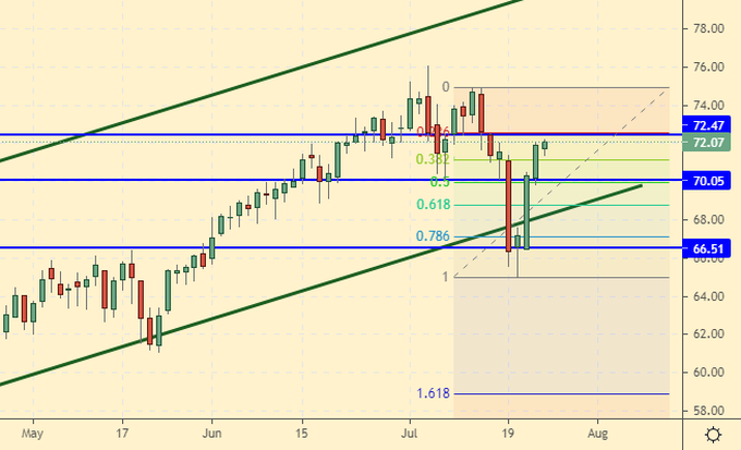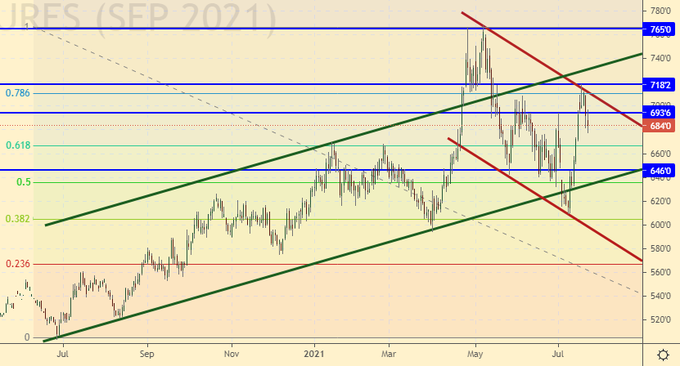 Growth scenario: July futures, expiration date July 30. The moment to buy was when we were at 69.00. We wrote about him a week ago. At the moment, the levels are high, we do not enter long.