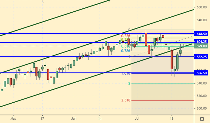 Growth scenario: September futures, expiration date September 14. So far, the expectation of a rollback down from the 700.00 area is justified. We do not buy.