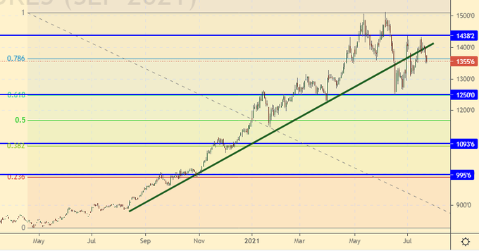 Growth scenario: September futures, expiration date September 14. Against the background of the improvement of the weather situation in the USA, we can expect a rollback to the 1100.0 area. We do not buy.