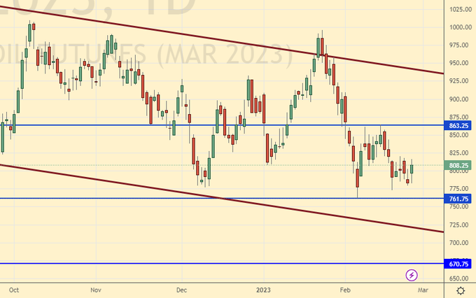 There is a lot of talk about the revival of China, but oil is in no hurry to grow. Moreover, there is a threat of falling below the 80 level, which could lead to a rapid drop in prices of 10 percent amid bulls’ frustration with the fact that Russia has both supplied oil, and delivers. We are not talking about any shortage of supply now. Everyone is dissatisfied, but they continue to work. With red faces they sell, with gray faces they buy.