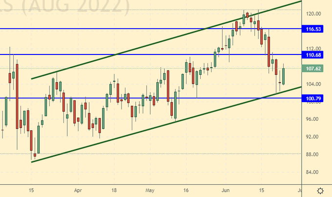 Growth scenario: we are considering the August futures, the expiration date is July 20. We will continue to refrain from going long. The support line is under the threat of a breakdown in the area of 100.00.
