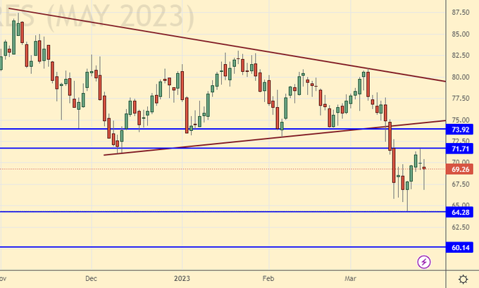 Growth scenario: we are considering the May futures, the expiration date is April 20. If we fall to 60.00 you can buy. It would be convenient to work out purchases from current levels on the watch.