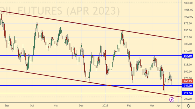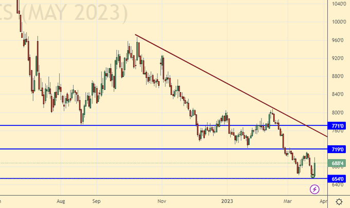 Growth scenario: consider the May futures, the expiration date is May 12. The market tested the 650.0 mark for strength, but could not go lower. We will buy again. Target at 770.0 remains.
