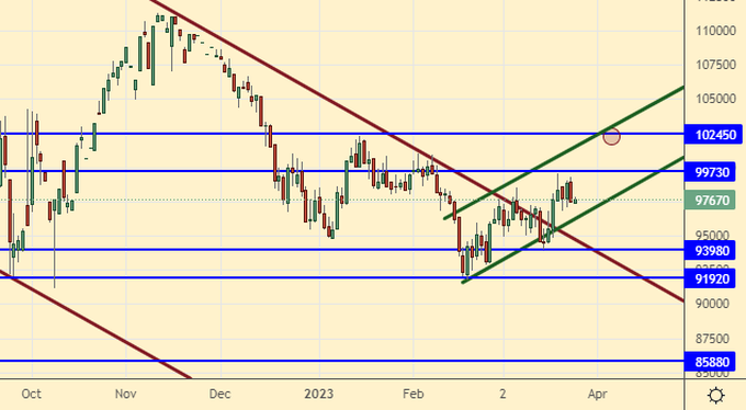 Growth scenario: we are considering the June futures, the expiration date is June 15. Technically, the market is ready to grow further, but it has little fundamental positive. The level of 102000 is the only thing we can see within the current growth. 112000 will be just a miracle.