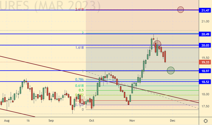 Growth scenario: we consider the March futures, the expiration date is February 28. The rollback continues. We will buy when approaching 19.00 and 18.50. Note that the level of 19.00 is likely to be stitched down.