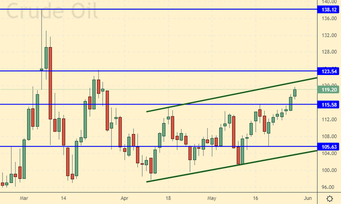 Growth scenario: we consider the June futures, the expiration date is June 30. Let’s continue to hold longs. In the case of a move above 125.00, a jerk to the 150.00 area may follow.