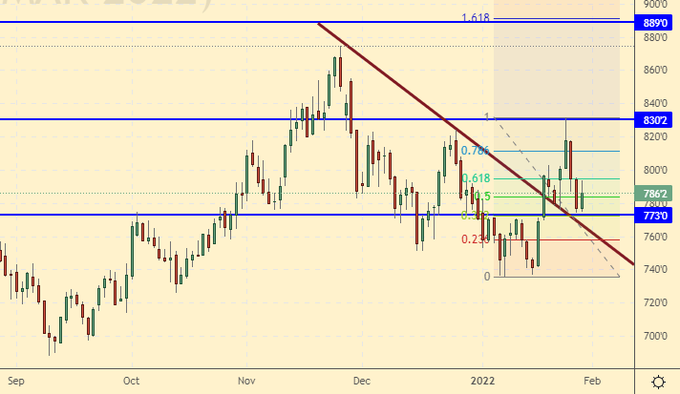 Growth scenario: March futures, the expiration date is March 14. The bullish mood remains. It is very likely that we will go to 685.0. Buying from current levels looks dangerous, you can enter long only in case of a rollback to 600.0.
