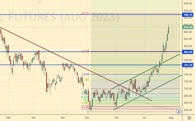 Growth scenario: consider the September futures, the expiration date is September 14th. Let’s continue to wait for the move to 660.0 in order to increase the long. The volatility is great. The scenario of the move to 870.0 remains.