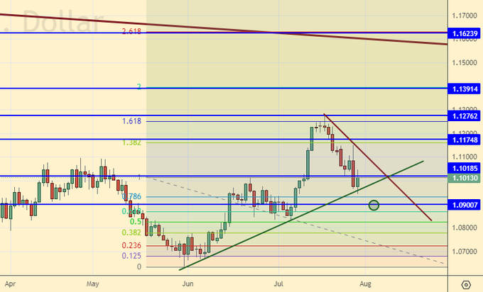 Fall scenario: they broke through the growing trend. Sell after any daily candle that closes below 1380. If after that there will be a rollback to 1430 — add.