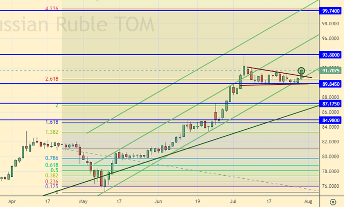 We do not have a rollback either to 85.00, or at least to 87.00. The market looks up to the level of 100.00. The 1% increase in the rate did not lead to the strengthening of the national currency, which makes forecasts for the strengthening of the exchange rate a thankless task at least until the end of August.