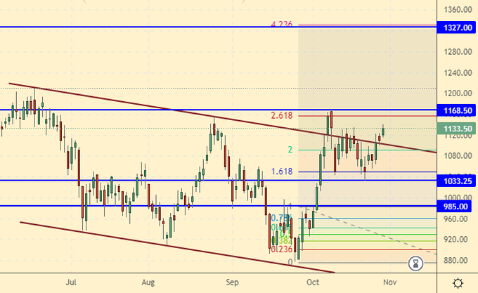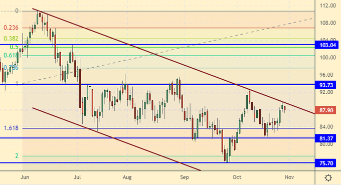 Growth scenario: we are considering the November futures, the expiration date is November 30th. We continue to recommend purchases. After rising above the level of 100.00, a strong increase may begin.