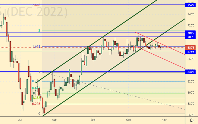 Sale: after falling below 670.0. Stop: 687.0. Target: 550.0. Who is in position from 688.0, move the stop to 693.0. Target: 550.0 cents per bushel.