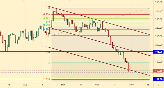 Growth scenario: consider the December futures, the expiration date is December 19. When approaching 160.00, we will buy. After touching 160.00, prices may return to the level of 190.00, possibly 210.00.