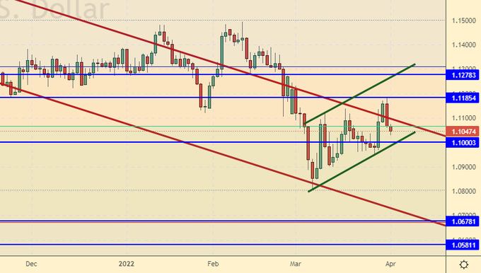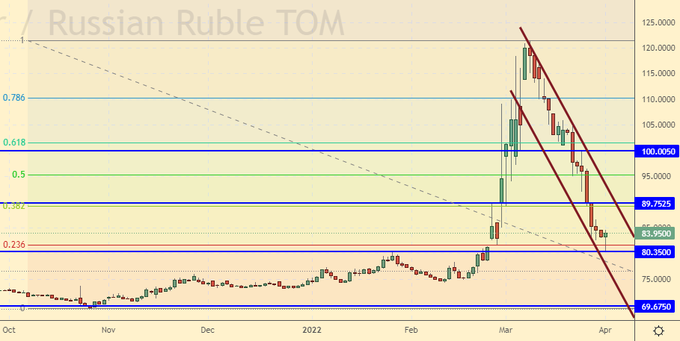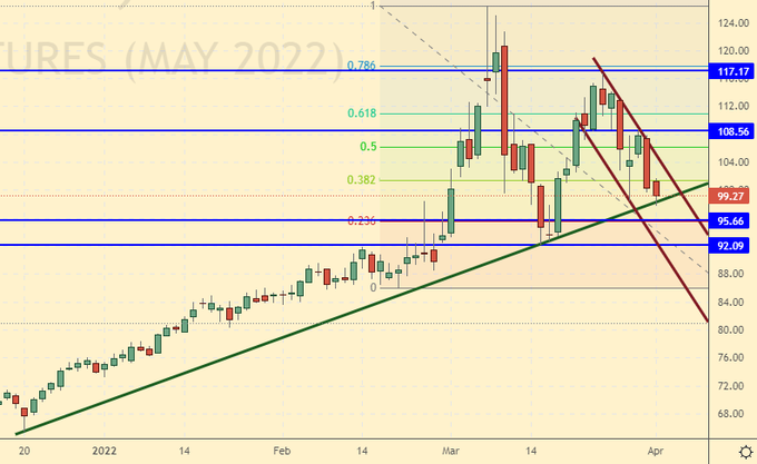 Growth scenario: we are considering the April futures, the expiration date is April 29. As long as Russia has not asked to pay for oil in rubles, the market has a chance for a correction towards 90.00.