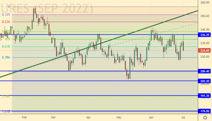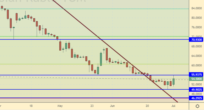 Over the past week, the difference between long and short positions of managers has decreased by 9.2 thousand contracts. There is a small outflow of buyers. While the situation is perceived as equilibrium. Growth scenario: we are considering the July futures, the expiration date is July 29. While we continue to refrain from buying, but it is worth following the news. Market sentiment may turn bullish again.